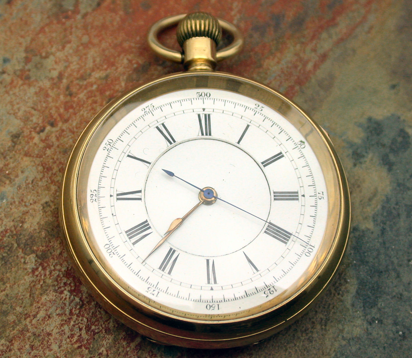 the white enamel dial with black roman and arabic numerals and hands, with stop watch facility