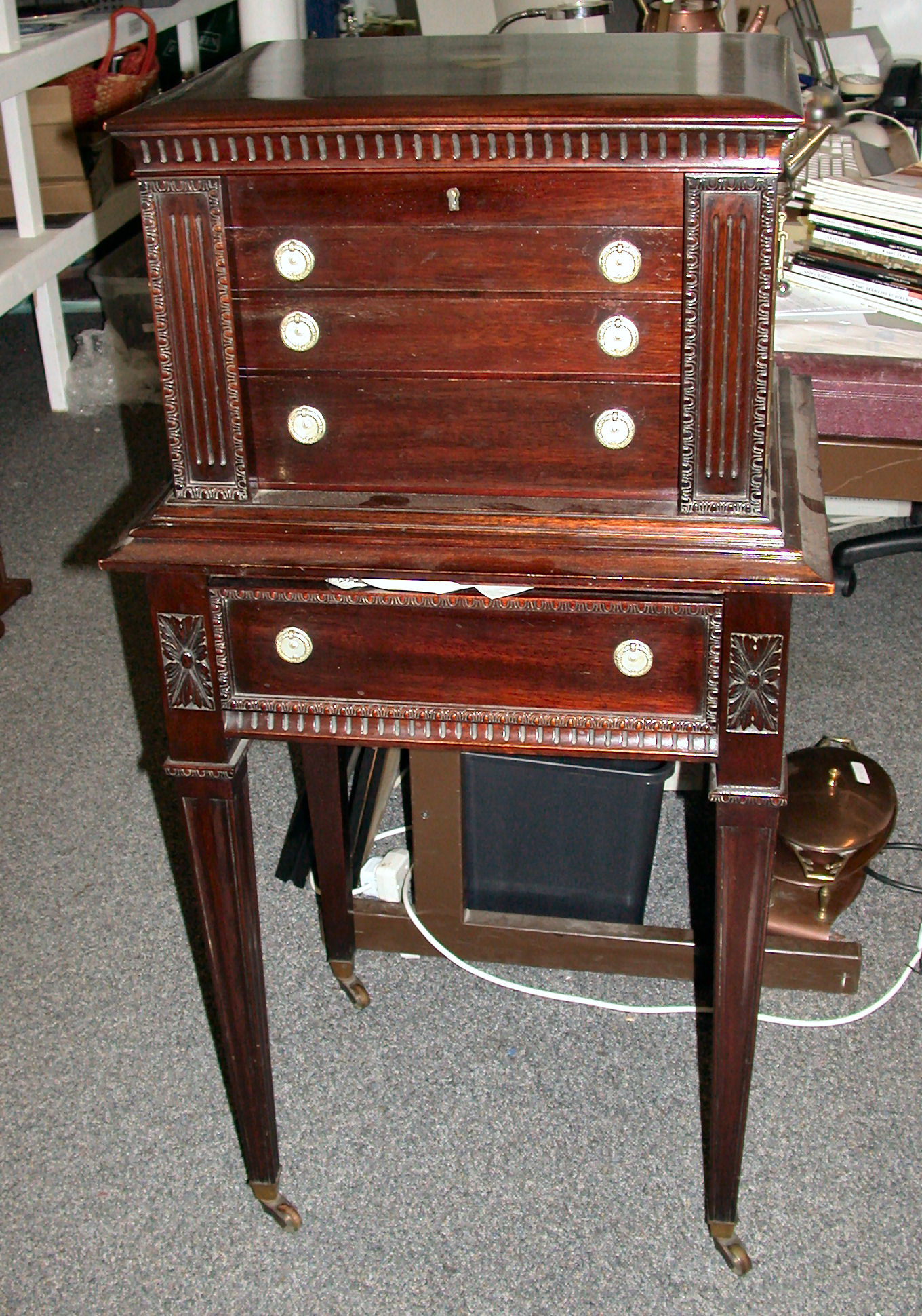 contained in a fitted Adam style mahogany case with egg and dart moulding, the hinged lid above four graduated drawers secured by hinged panels, on a separate base with single drawer and square section tapering legs with brass caps and castors