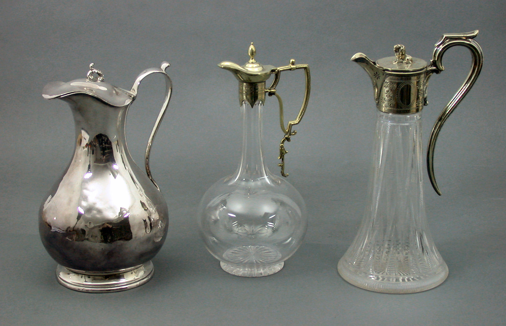 of tapered cylindrical form, with floral engraved mounts and lion finial to the flat hinged cover, another electropate mounted glass claret jug, of baluster form, and a baluster form plated lidded ewer (3)