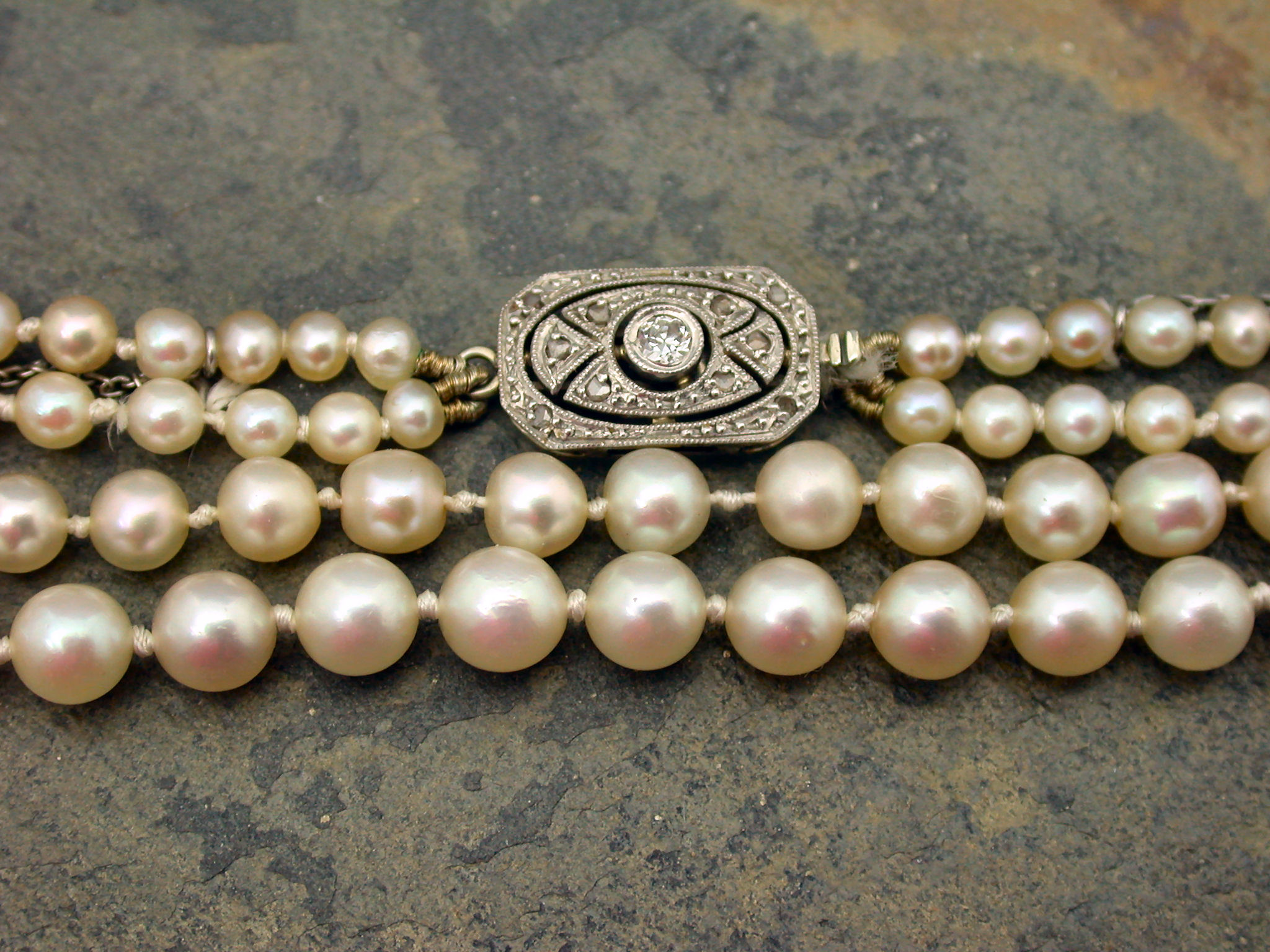 composed of graduated beads ranging from approximately 3mm to 5mm, with rose cut diamond set pierced canted rectangular clasp with central collet set round brilliant cut diamond