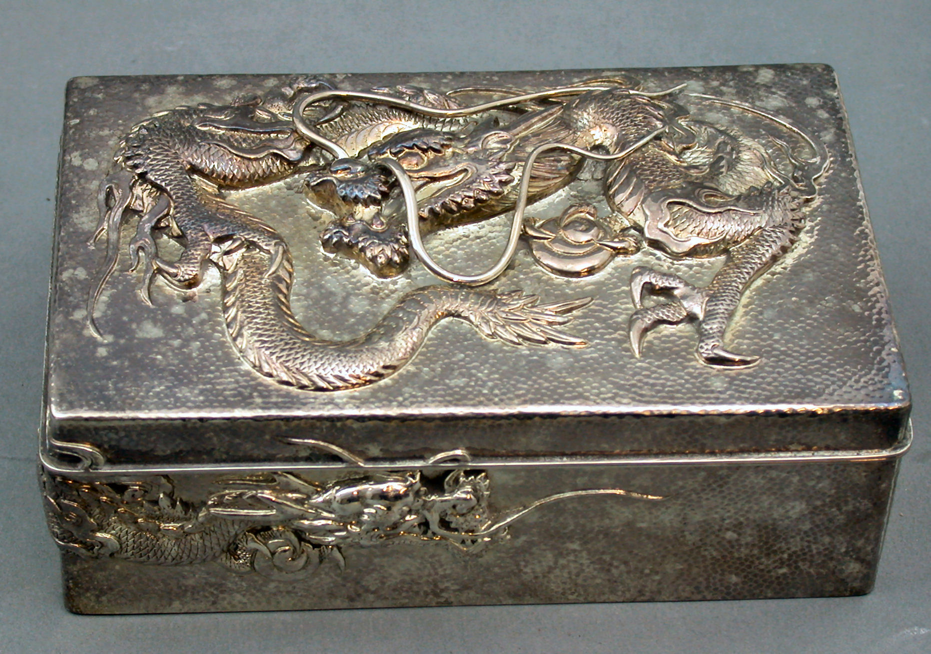 with planished finish, cast with scrolling dragons, with hinged cover
