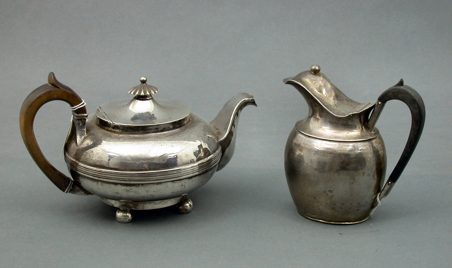 with marks for Hamilton & Co. of Calcutta, of circular outline, with reeded girdle and fluted finial, on four bun feet, crested together with a continental silver hot water pot, bright engraved. (2)