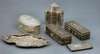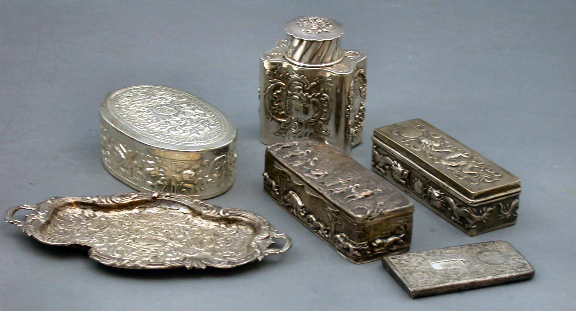 with marks for Birmingham 1903, maker GH, of rectangular form, the cover cast with rural figures in a landscape the sides with scenes of hounds hunting wild boar, a scroll decorated miniature twin handled tray, Birmingham 1891, a scroll decorated tea caddy, with import marks for London 1893, a vesta case and two Eastern oval boxes (6)