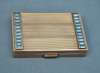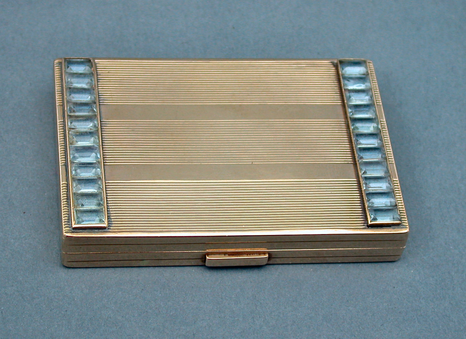 signed, of rectangular form with reeded borders, the hinged cover set with two rows of rectangular cut pale blue stones, the inner cover inscribed Elizabeth