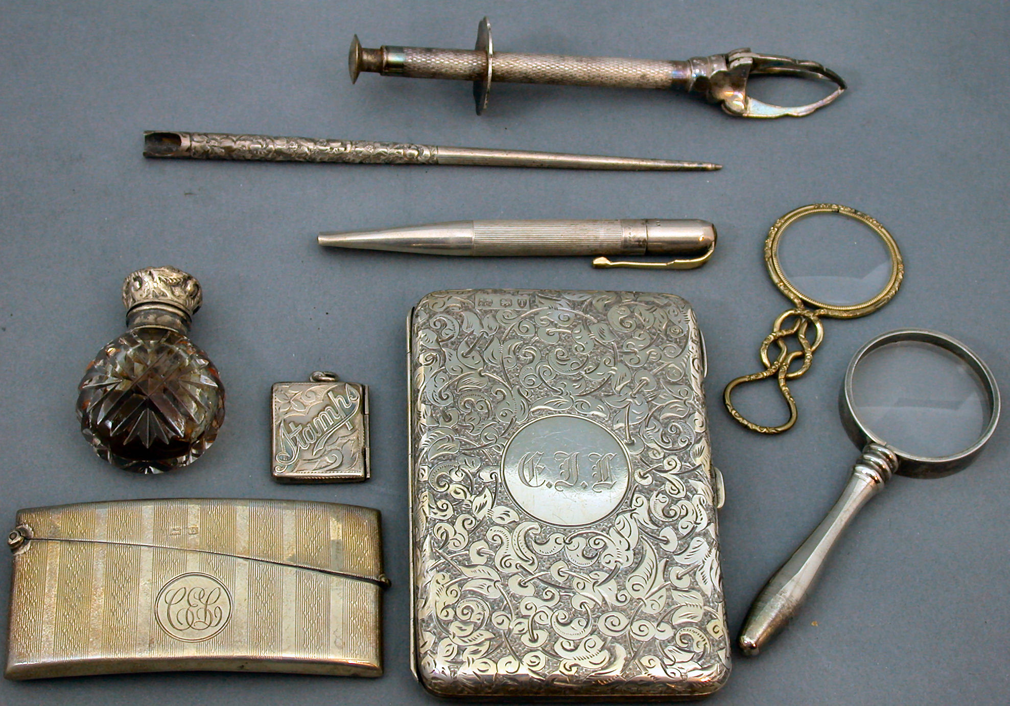 to include a foliate scroll aide memoir, London 1894, an engine turned card case, Birmingham 1921, a foliate decorated stamp case, Chester 1903, a mounted cut glass scent bottle, two magnifying glasses, and other pieces (9)