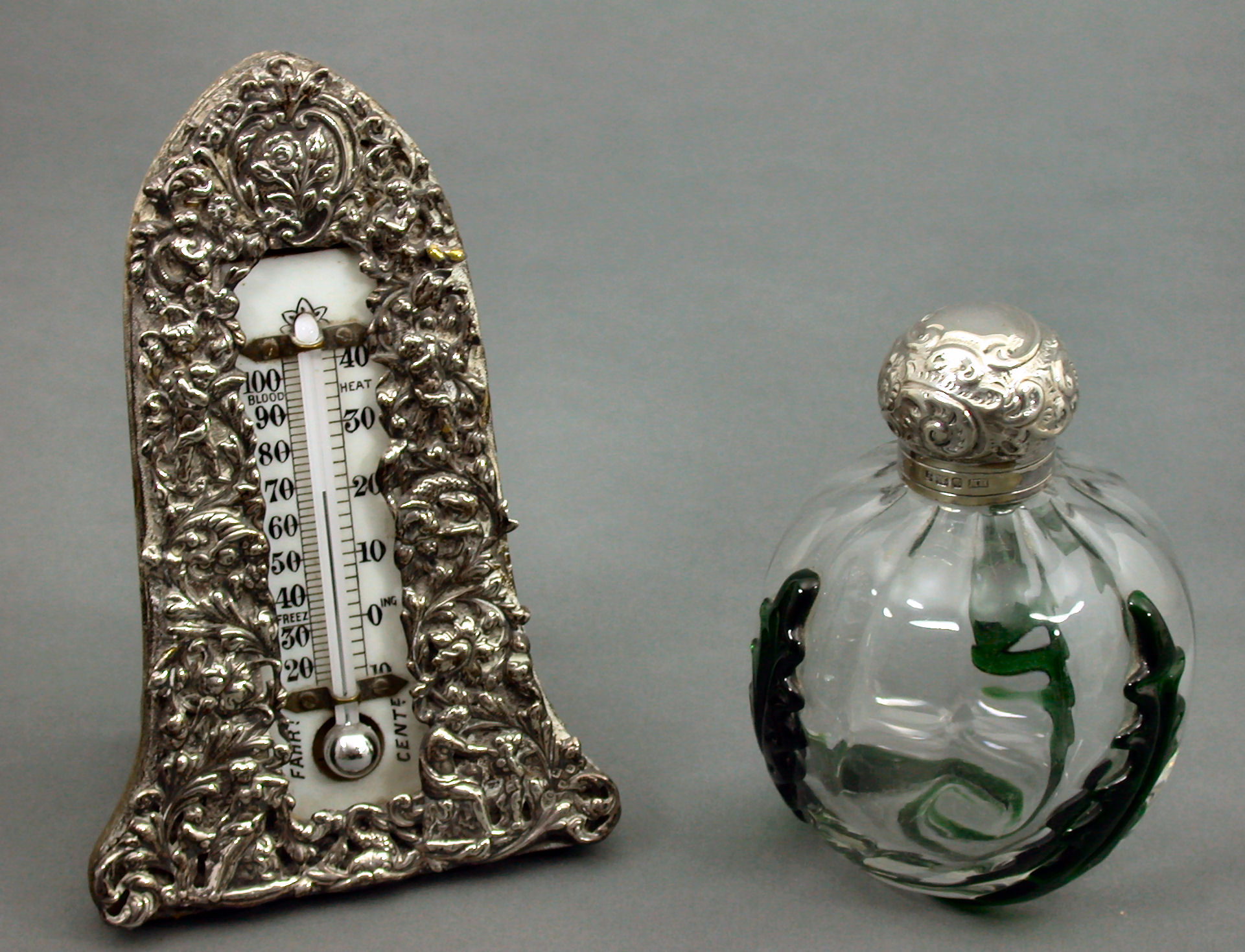 with marks for London 1897, maker William Comyns, of arched form, decorated with foliate scrolls and figures, together with a mounted globular glass scent bottle, Sheffield 1898
