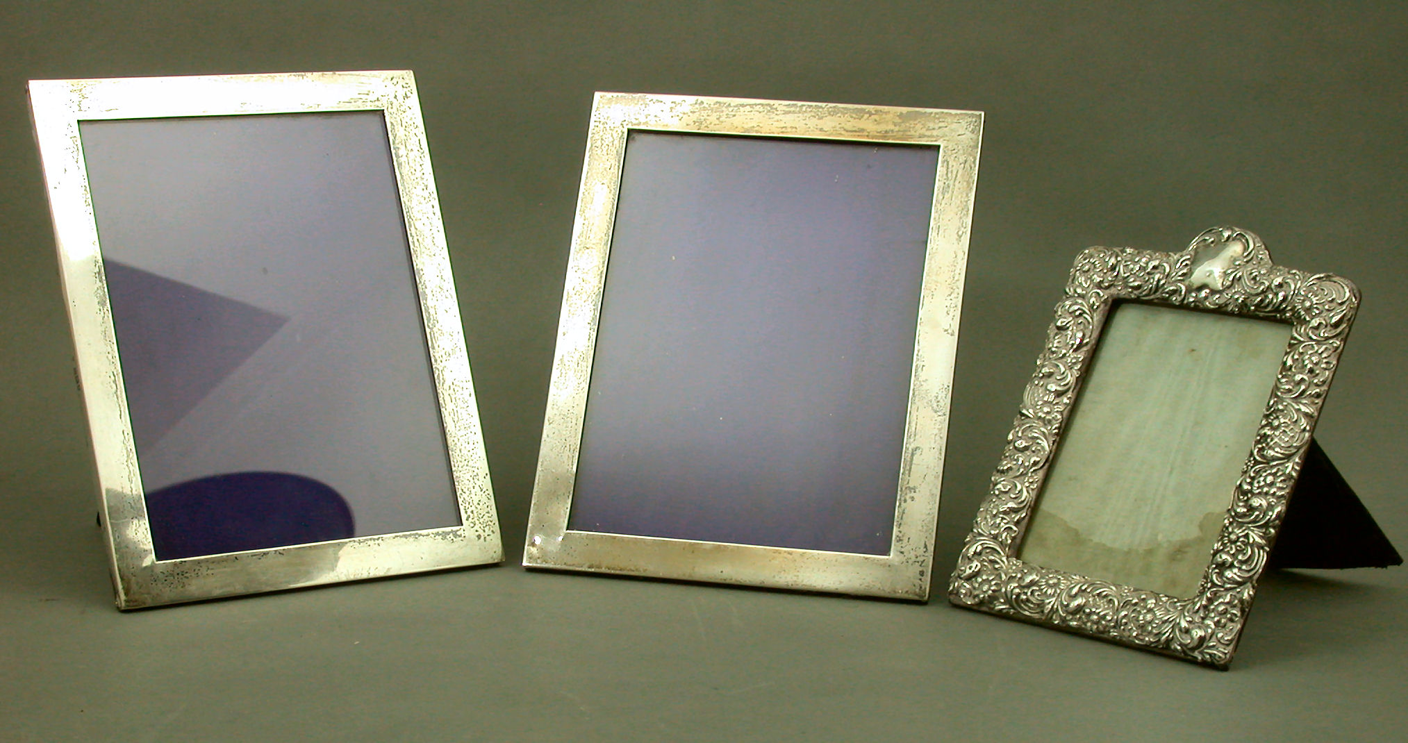with marks for London 1907 and 1908, maker William Comyns, of plain rectangular form, together with a shaped rectangular foliate scroll decorated photograph frame, Birmingham 1901, maker WD (3)