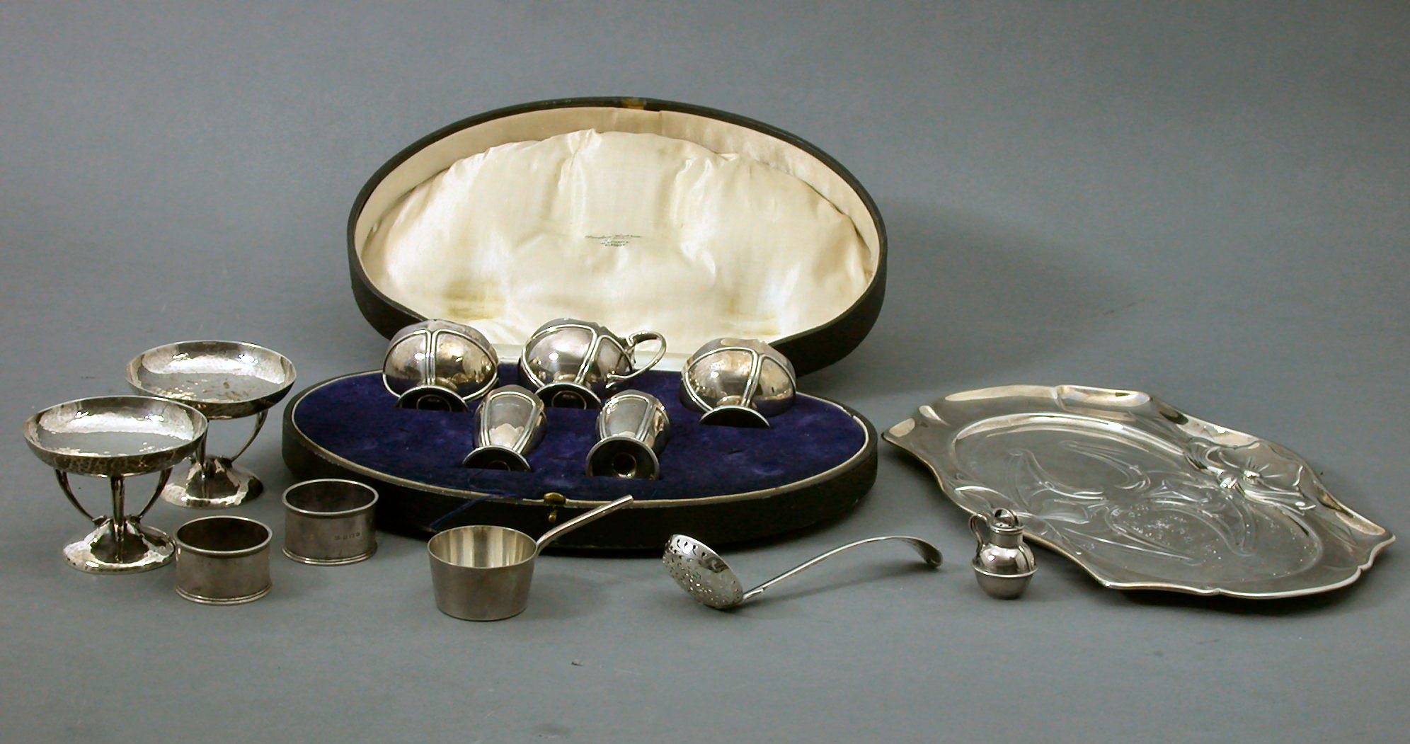 with marks for Birmingham 1945, maker ES Barnsley & Co, each of lobed circular outline, a pair of planished bon bon dishes, Glasgow 1905, a shaped oval tray, London 1901, with Art Nouveau stylised decoration, a sifter spoon, a pair of napkin rings, an electroplated miniature Jersey pail and a miniature sauce pan (qty)