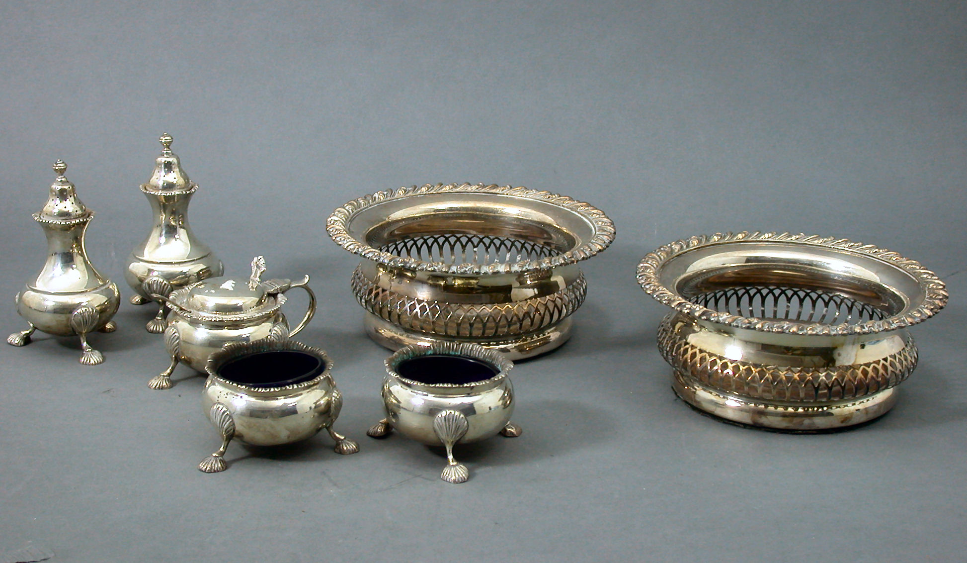 with marks for London 1947, maker's mark RC, each of circular outline, with gadrooned border on three shell capped shell feet, with blue glass liners also a salt spoon and a pair of electroplated bottle coasters (8)