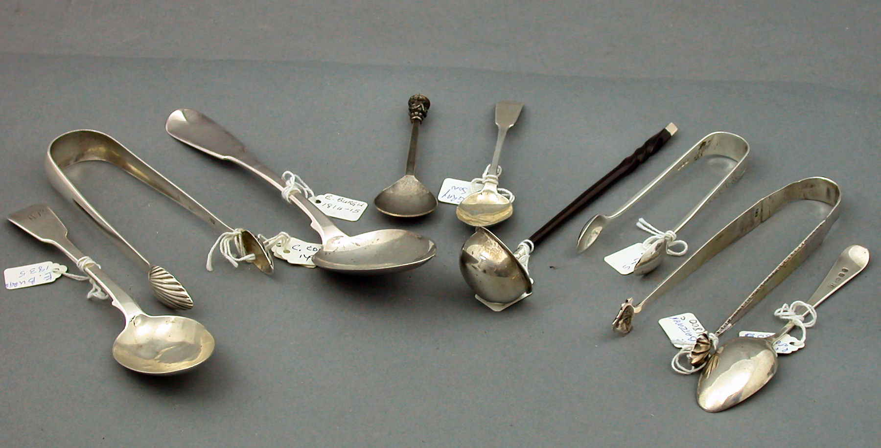 including pieces from London, Edinburgh, Chester, Ireland, Glasgow, various dates from 1760 to circa 1920, including tea, table, salt and other spoons, sugar tongs and other pieces