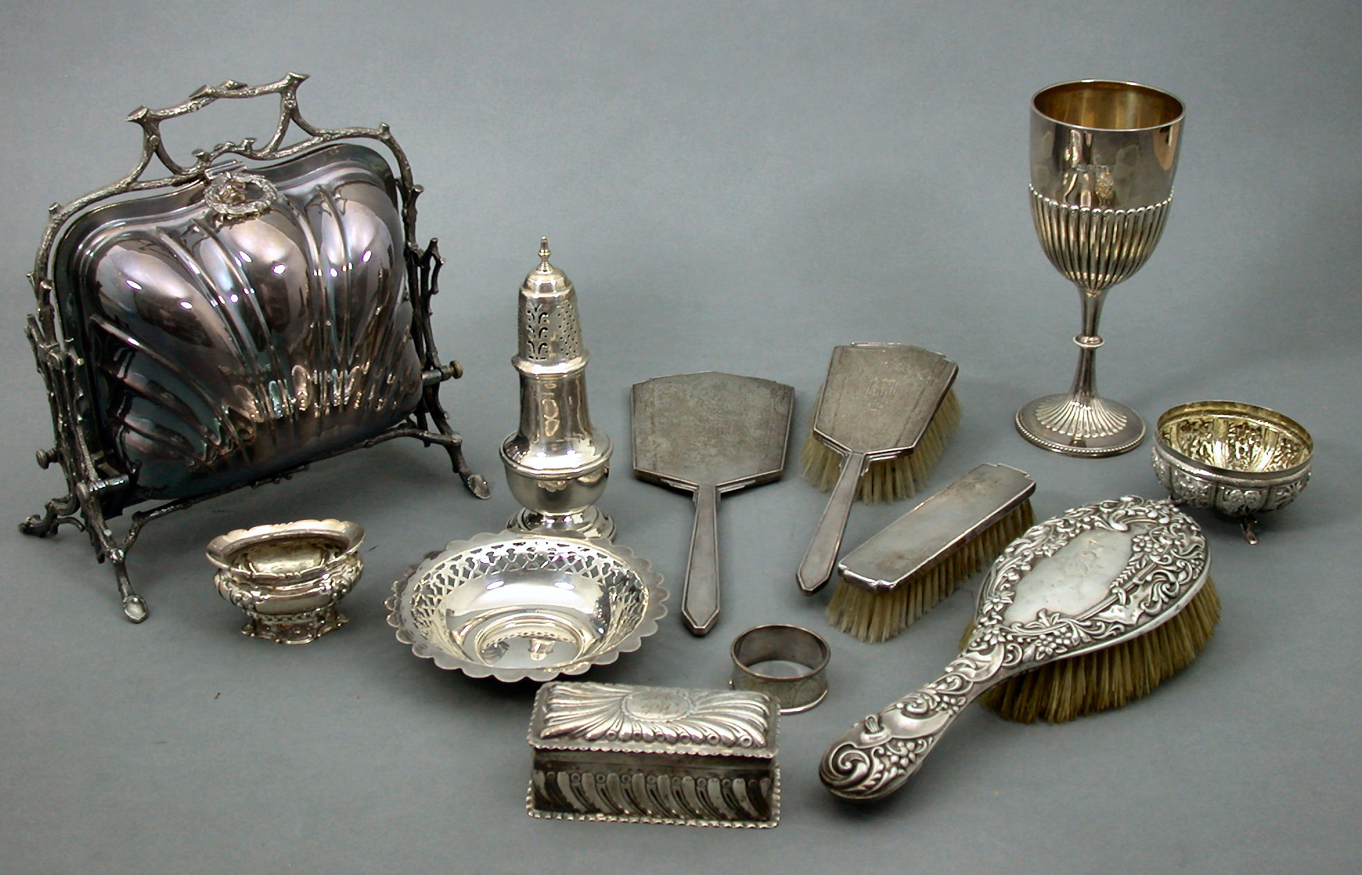 to include a semi-fluted goblet, Sheffield 1903, with bead borders, a rectangular semi-fluted box with cover, London 1890, a caster, Chester 1915 and various other pieces, some electroplated (qty)