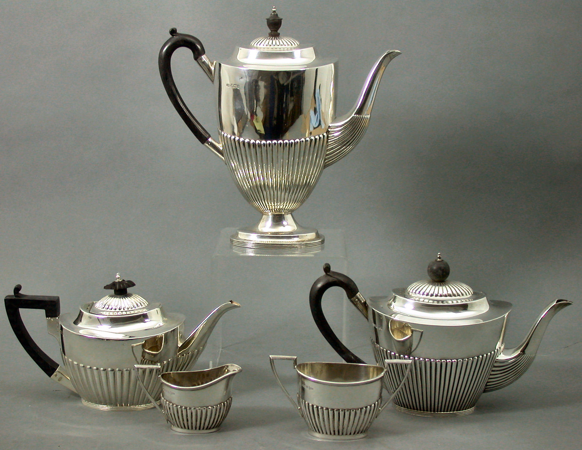 with marks for Sheffield 1897 and 1907, maker's Mappin & Webb and Walker & Hall, comprising two teapots, a coffee pot, a twin handled sugar and cream jug, each of oval semi-fluted form (5)