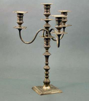with marks for London 1892, 1893 and 1894, maker Turner Bradbury, the square base beneath a knopped column, three reeded branches, with waisted capitals and square sockets, with gadrooned borders throughout