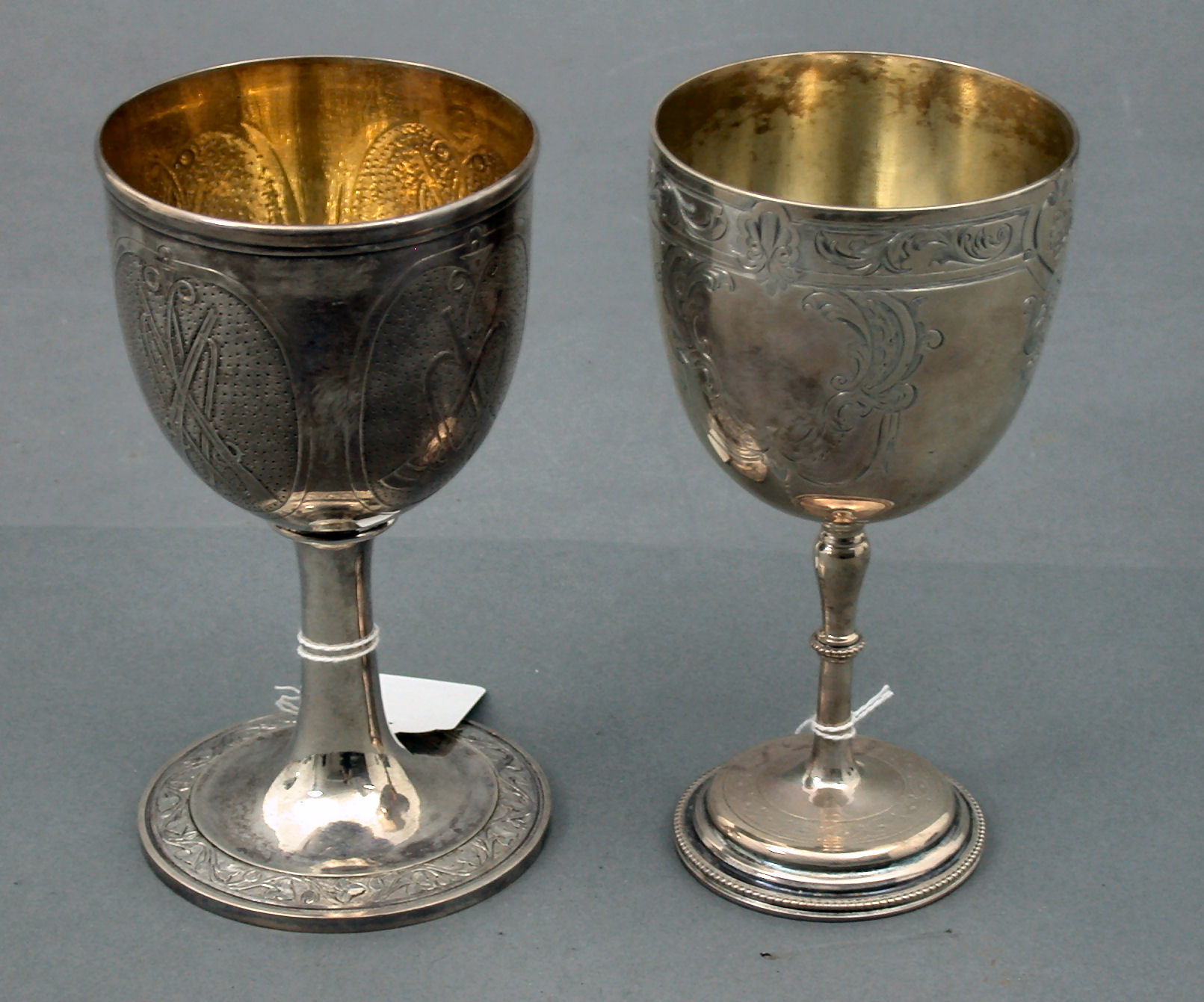 with marks for London 1863, maker's mark JB, decorated with panels containing crossed rifles and bugles, to a stippled ground, together with a foliate scroll engraved goblet, London 1865, with bead borders (2)