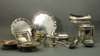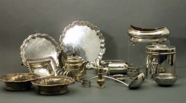 to include a Georgian shaped oval dish with reeded border, a bachelor's semi-fluted teapot, London 1882, a helmet form cream jug, Birmingham 1909, a strainer, London 1971, a lidded mustard, a pepper and a collection of electroplated items (qty)