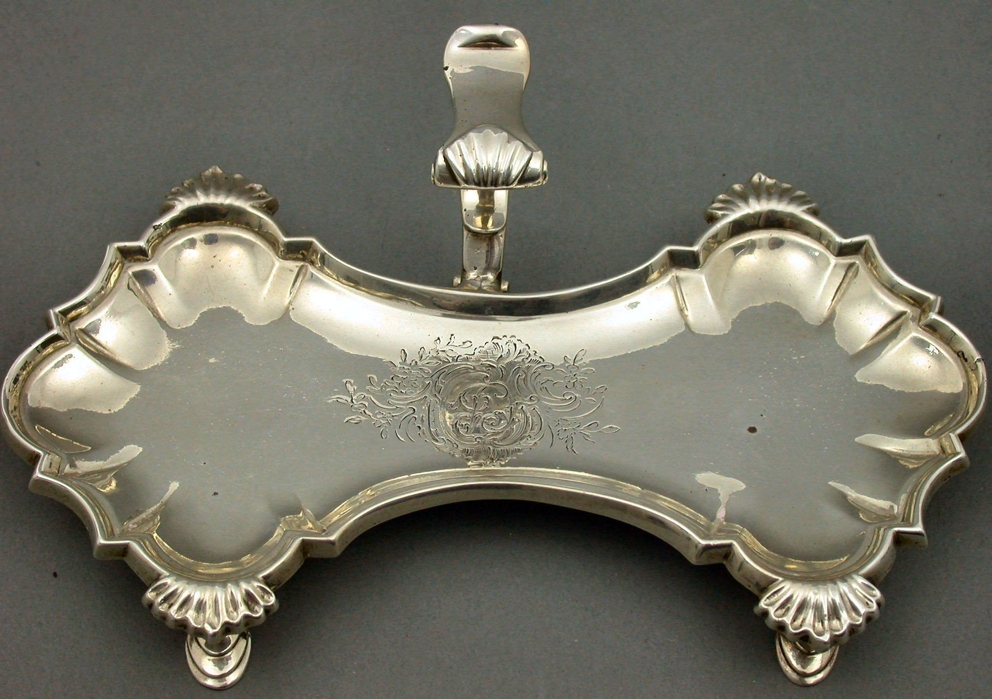with marks for London 1757, maker unknown, the central scroll handle onto a waisted shell clasped serpentine platform with engraved monogram within a floral cartouche, all raised on four cabriole legs with hoof feet, with scratch weight to the underside, 7=15