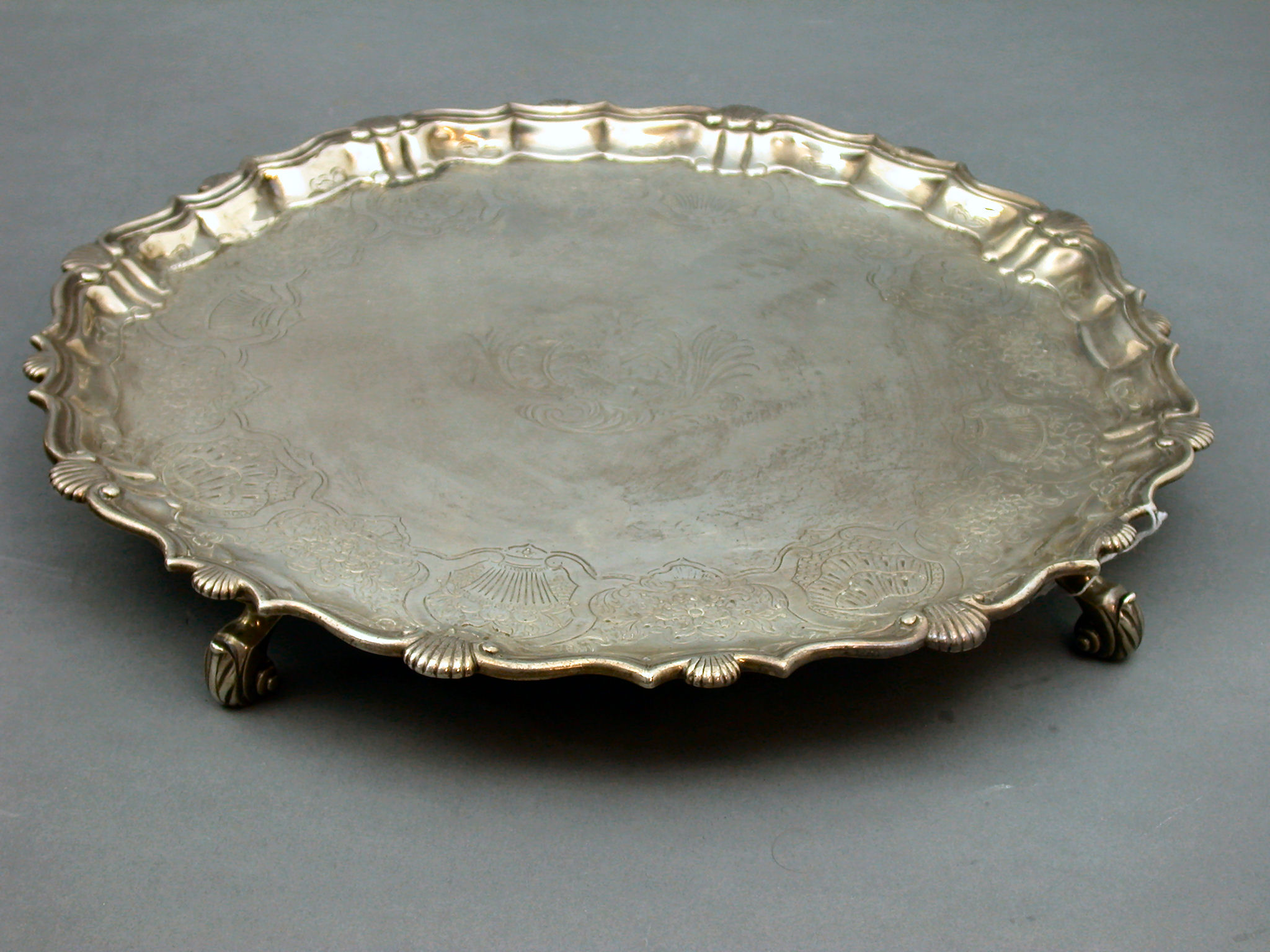 with marks for London 1740, maker Elizabeth Tuite, of shaped circular form, with shell cast edge and pie-crust moulded border, raised on four leaf capped scroll feet, later chased, with central engraved armorial
