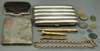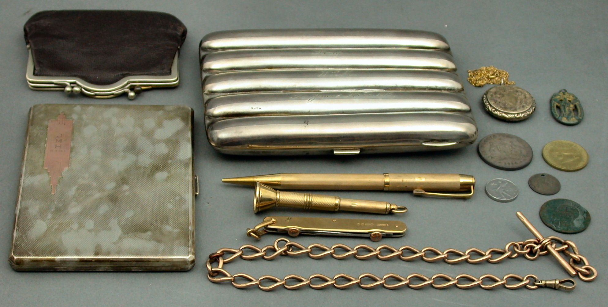 with T-bar suspension, a 9ct gold cigar piercer, a 9ct gold Yard-O-Led propelling pencil, a 9ct gold folding knife, a silver cigar case, a silver cigarette case, a purse, locket and assorted coins (qty)