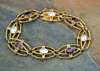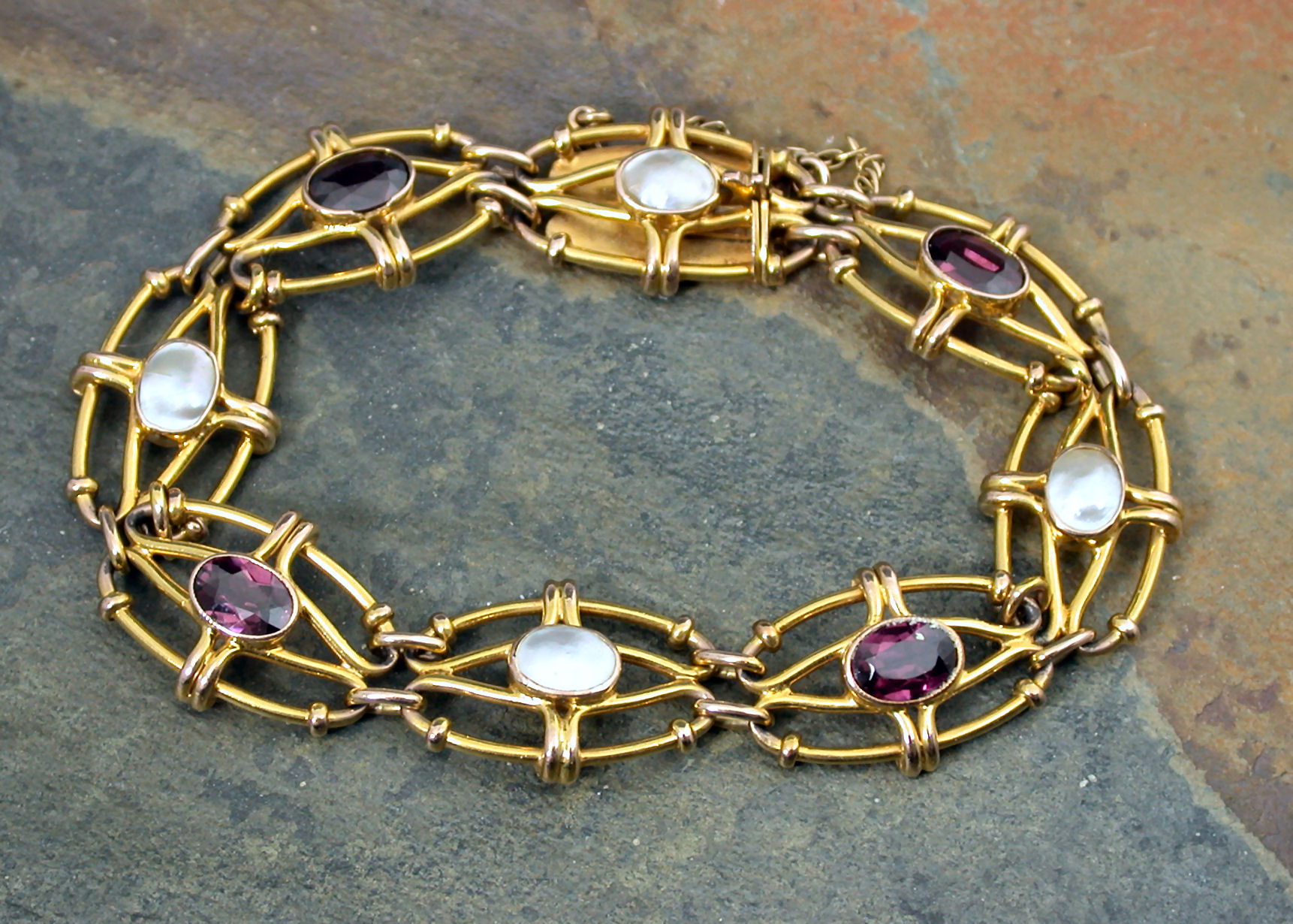 composed of pierced oval panels alternately collet set to the centre with oval cut garnets and blister pearls