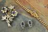 with central claw set circular cut sapphire flanked to either side by an old European cut diamond, within a scroll surround, with snap fastening, a floral spray brooch set with rose cut diamonds and synthetic sapphires, also a pair of earrings (qty)