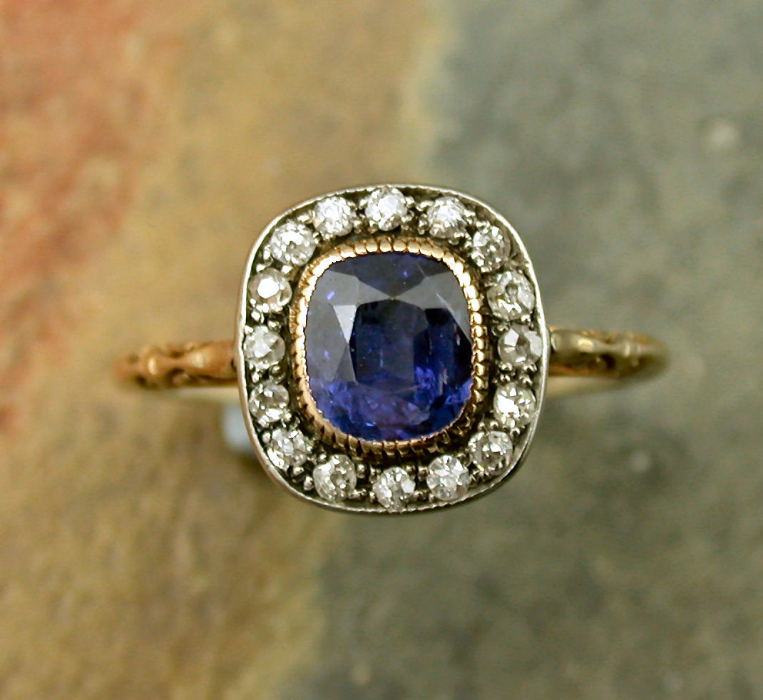 with central collet set cushion cut sapphire, within a surround of single cut diamonds, flanked by scroll carved shoulders