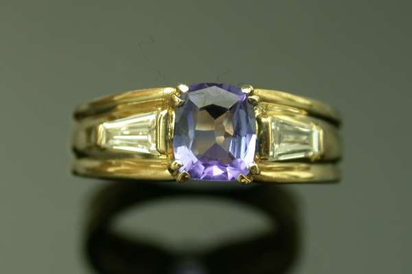 designed as a broad band, claw set to the centre with a cushion cut tanzanite, flanked to either side by a channel set tapered baguette cut diamond, the shank signed to the interior Boucheron P 51104 OR750, also struck with French control marks