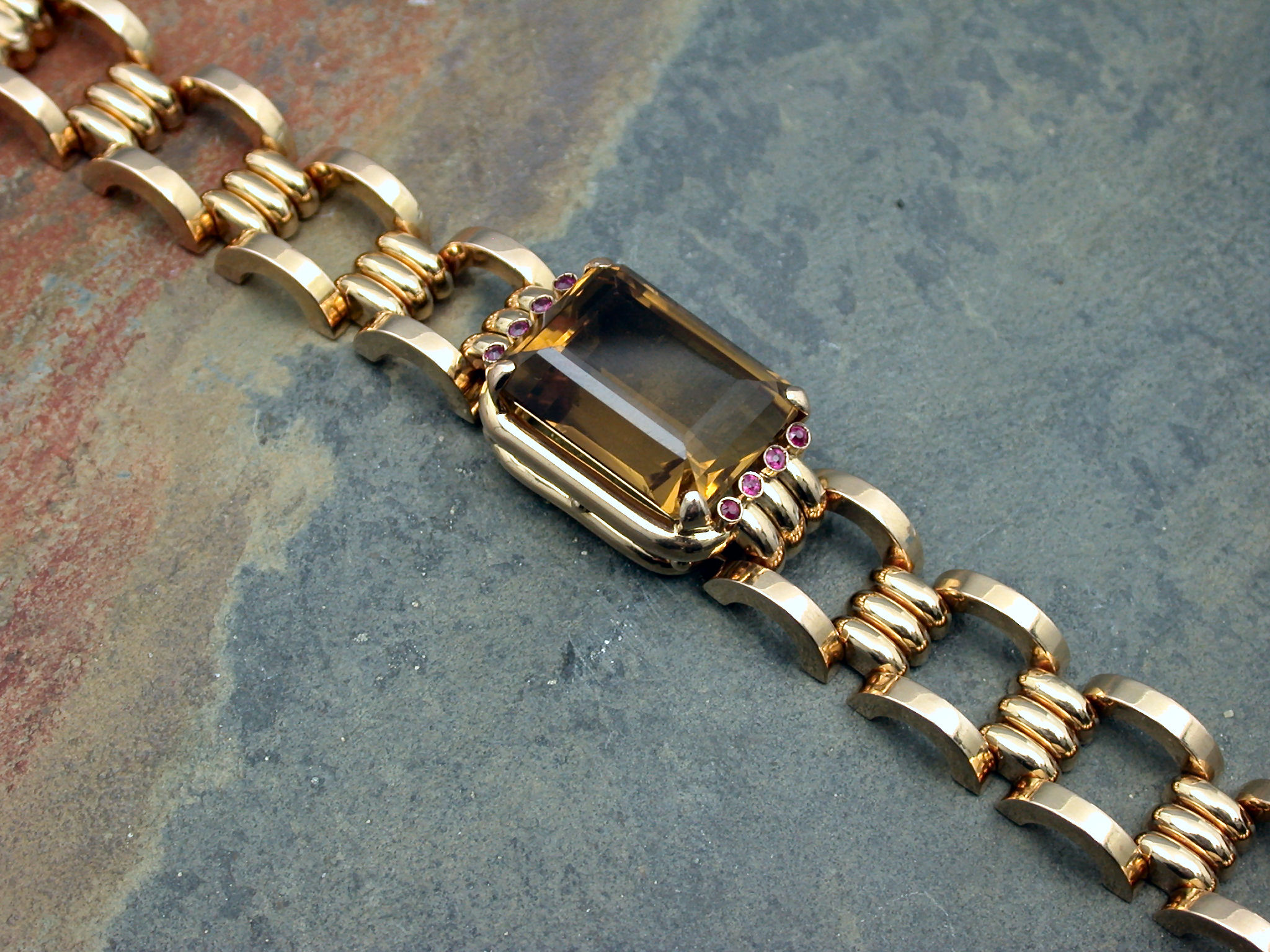 with central trap cut citrine. flanked to either side by four circular cut rubies, to a fancy link bracelet, stamped 18K