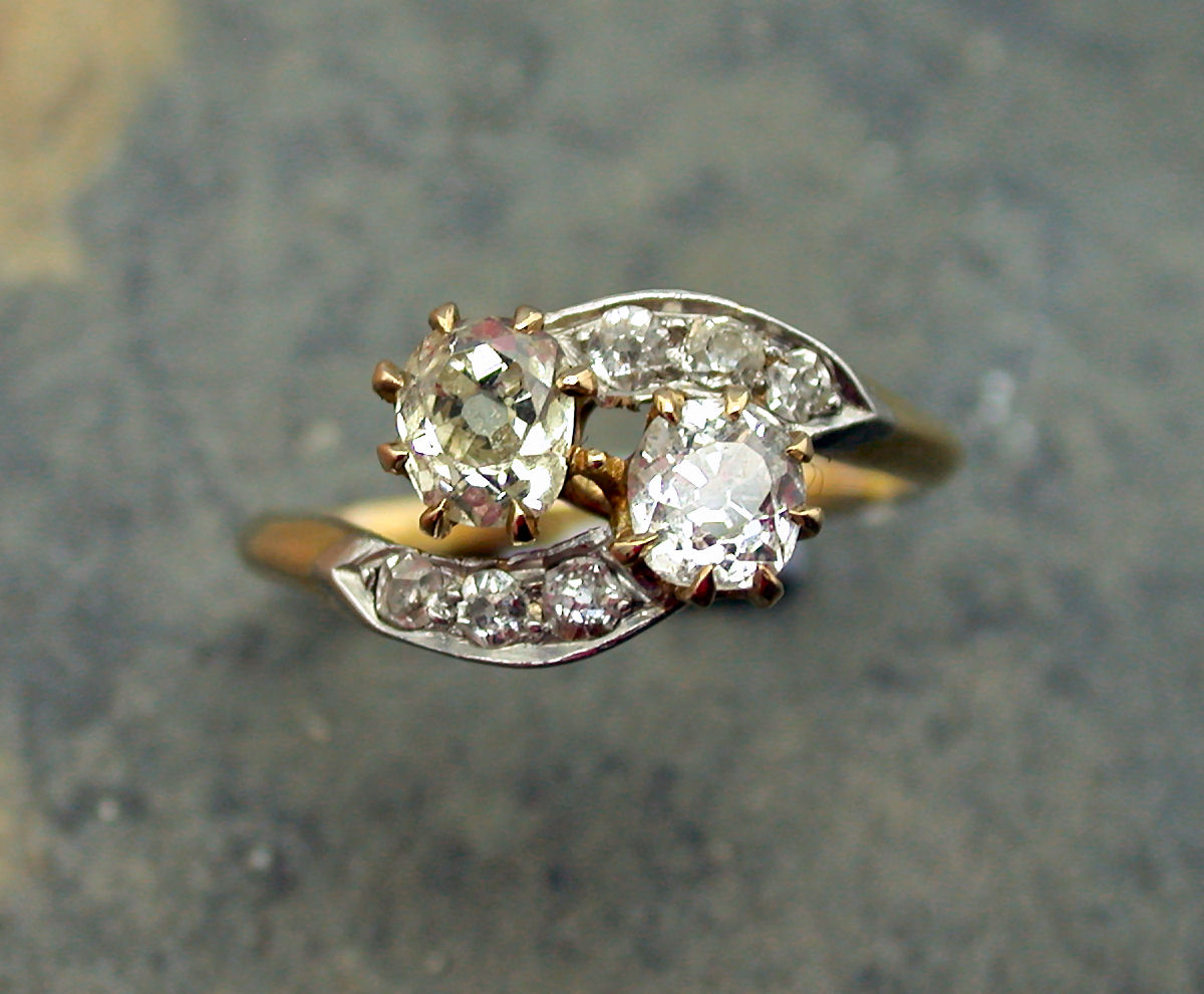 claw set to the centre with two old mine cut diamonds flanked by single cut diamond set scroll form shoulder