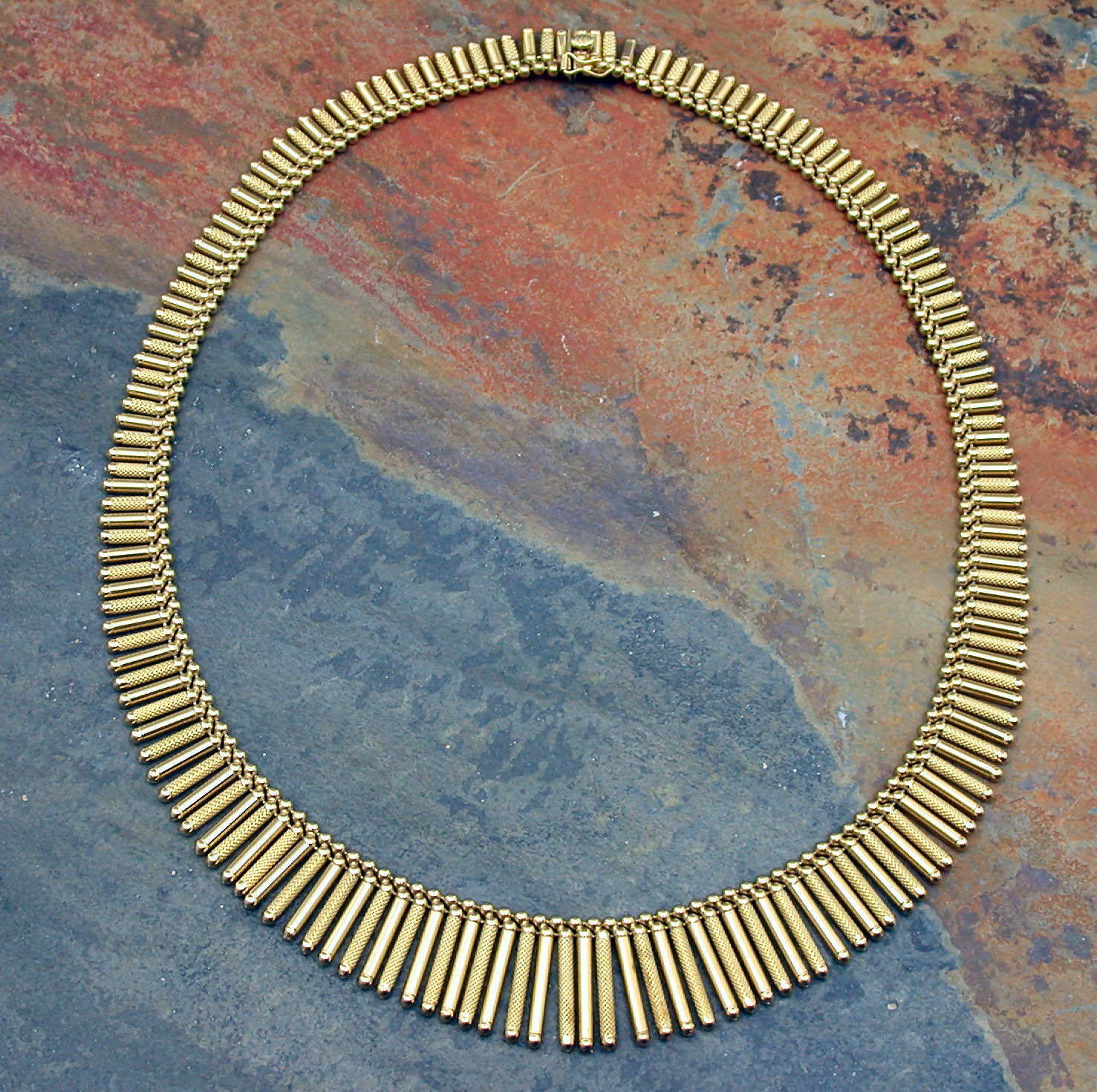 composed of graduated cylindrical fringe links, alternately textured and smooth, with bead terminals, with snap fastening