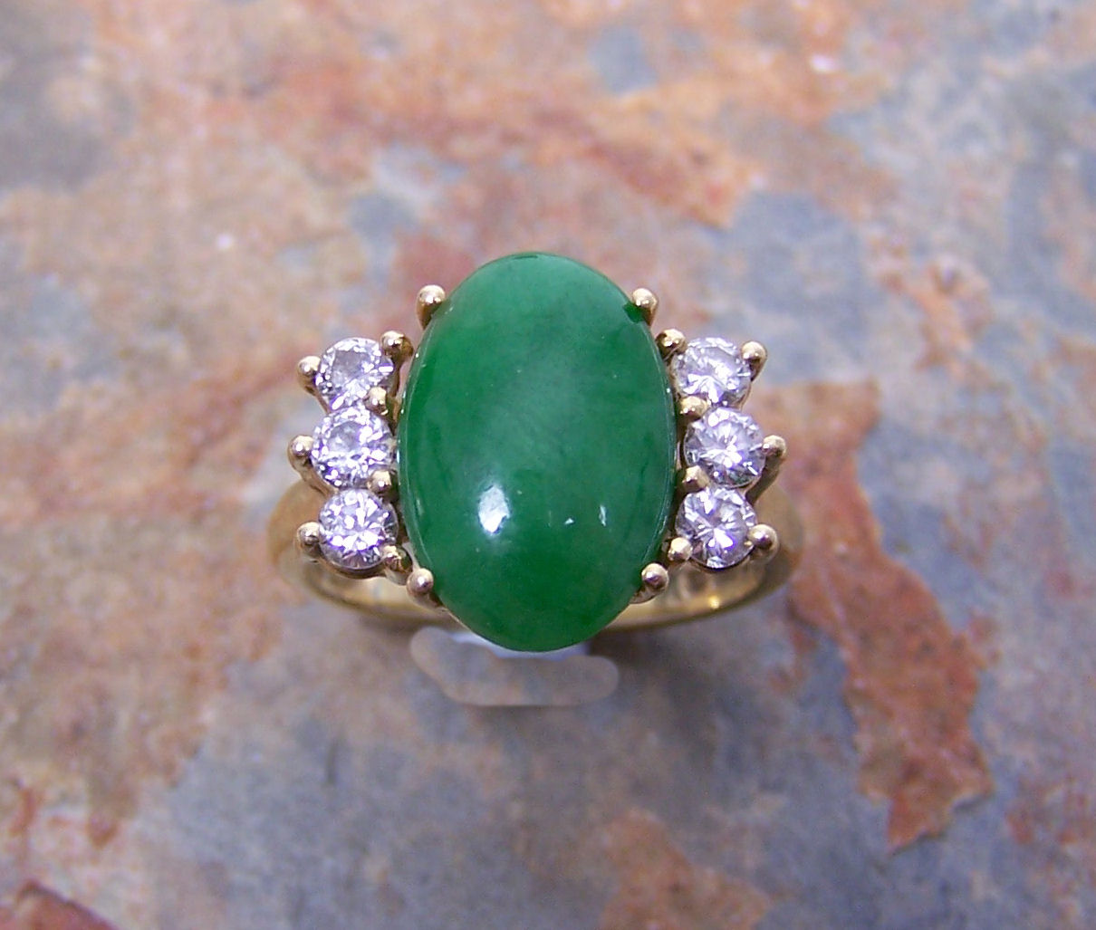 the central claw set oval cut jade cabochon, flanked to either side by three vertically set round brilliant cut diamonds