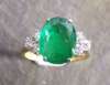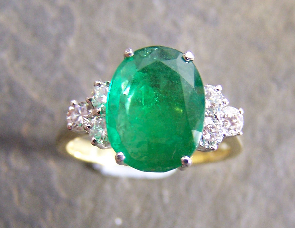 the central claw set oval cut emerald flanked to either side by three similarly set round brilliant cut diamonds