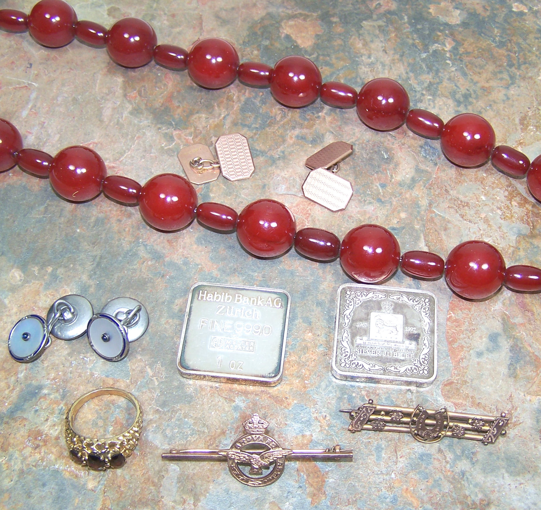 to include a pair of 9ct rose gold engine turned cufflinks; assorted stickpins and bar brooches; two garnet set rings; a gilt metal mounted oval shell cameo brooch and other pieces (Qty)