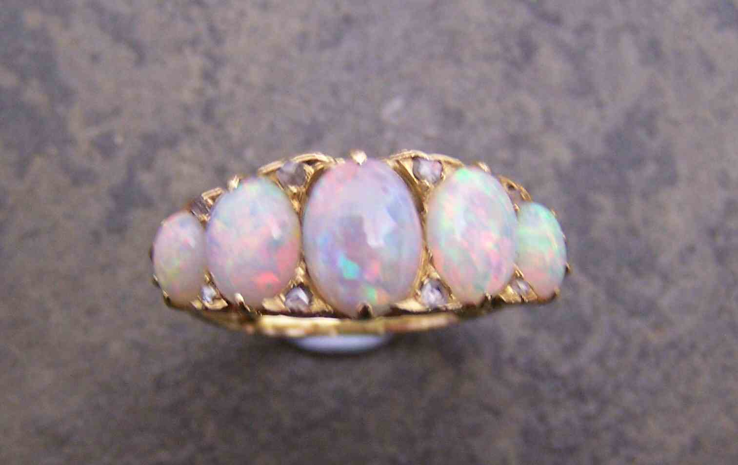 set with five graduated oval cut opal cabochons, with pairs of rose cut diamonds between and scroll pierced gallery