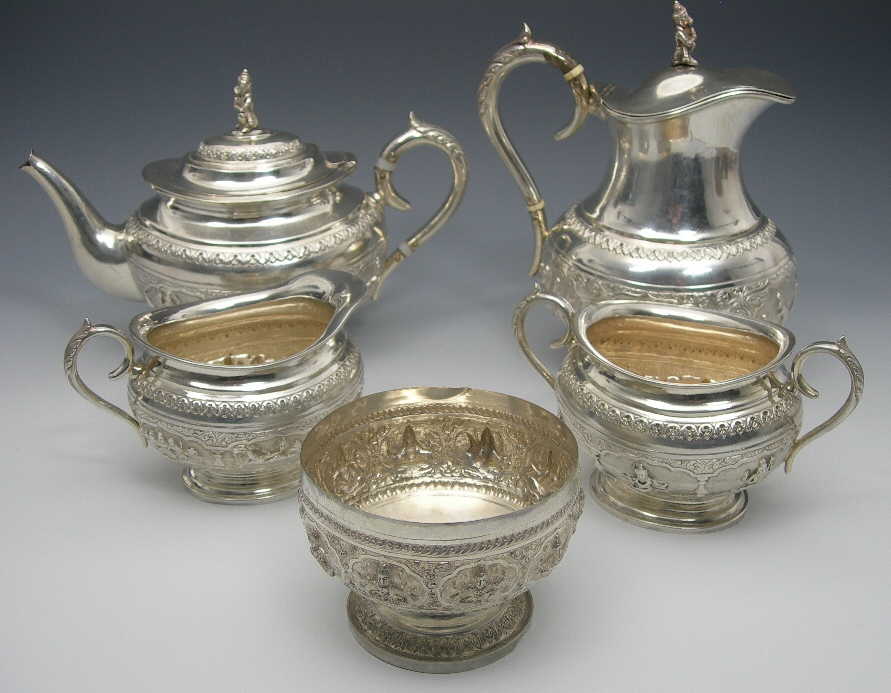 comprising a teapot, coffee pot, milk jug, sugar bowl and slop bowl, each decorated with embossed eastern figures and scenes (5)