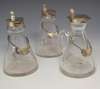 by S Blanckensee & Sons Ltd, Chester 1935 and Birmingham 1936, (maker's mark worn), each with glass body, of typical form, with star cut base, plain flat hinged cover and thumb-piece; together with a matched set of three spirit labels inscribed WHISKY