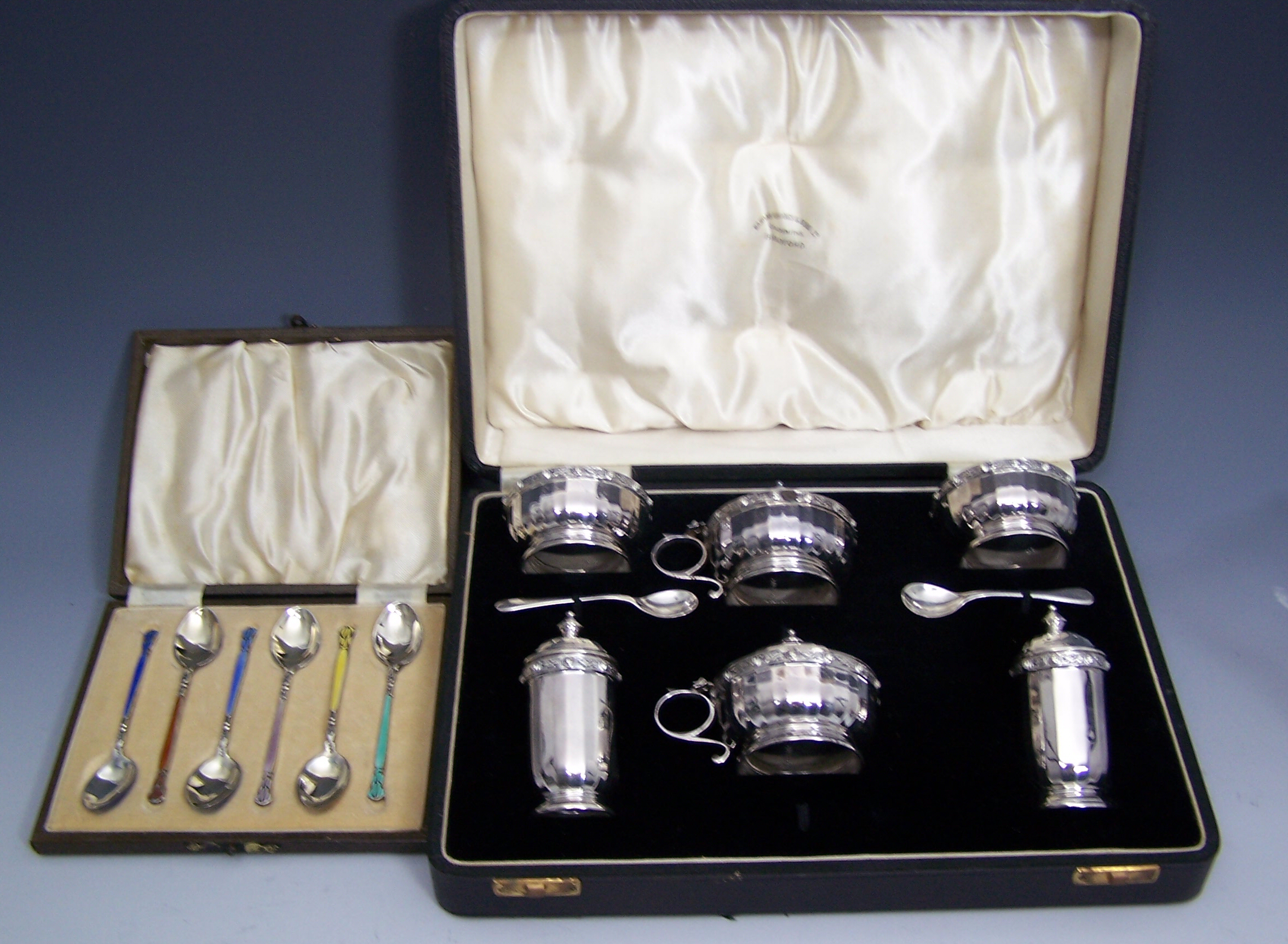 by Adie Brothers, Birmingham 1935, comprising pairs of open salts, covered mustards and pepper casters, each of panelled form, with Celtic cast borders, also a pair of Old English pattern salt spoons, cased; a cased set of Art Nouveau enamelled coffee spoons, Birmingham 1934, with stylised floral stems and finials; together with a small collection of mainly Georgian flatware (Qty)
