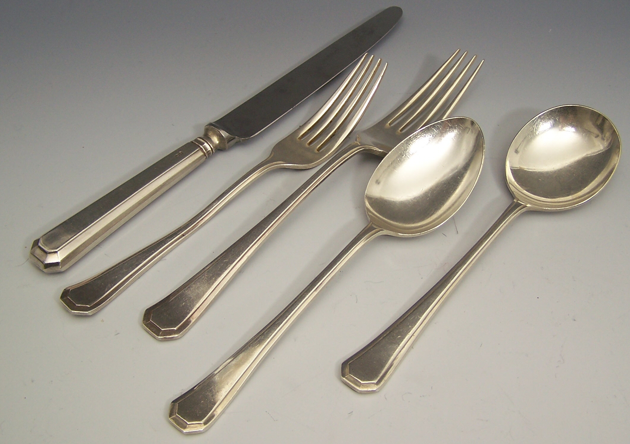 by J B Chatterly and Sons, Sheffield 1971 and 1972, comprising six soup spoons, six dessert spoons, six table forks, five dessert forks and twelve knives with steel blades (Qty)