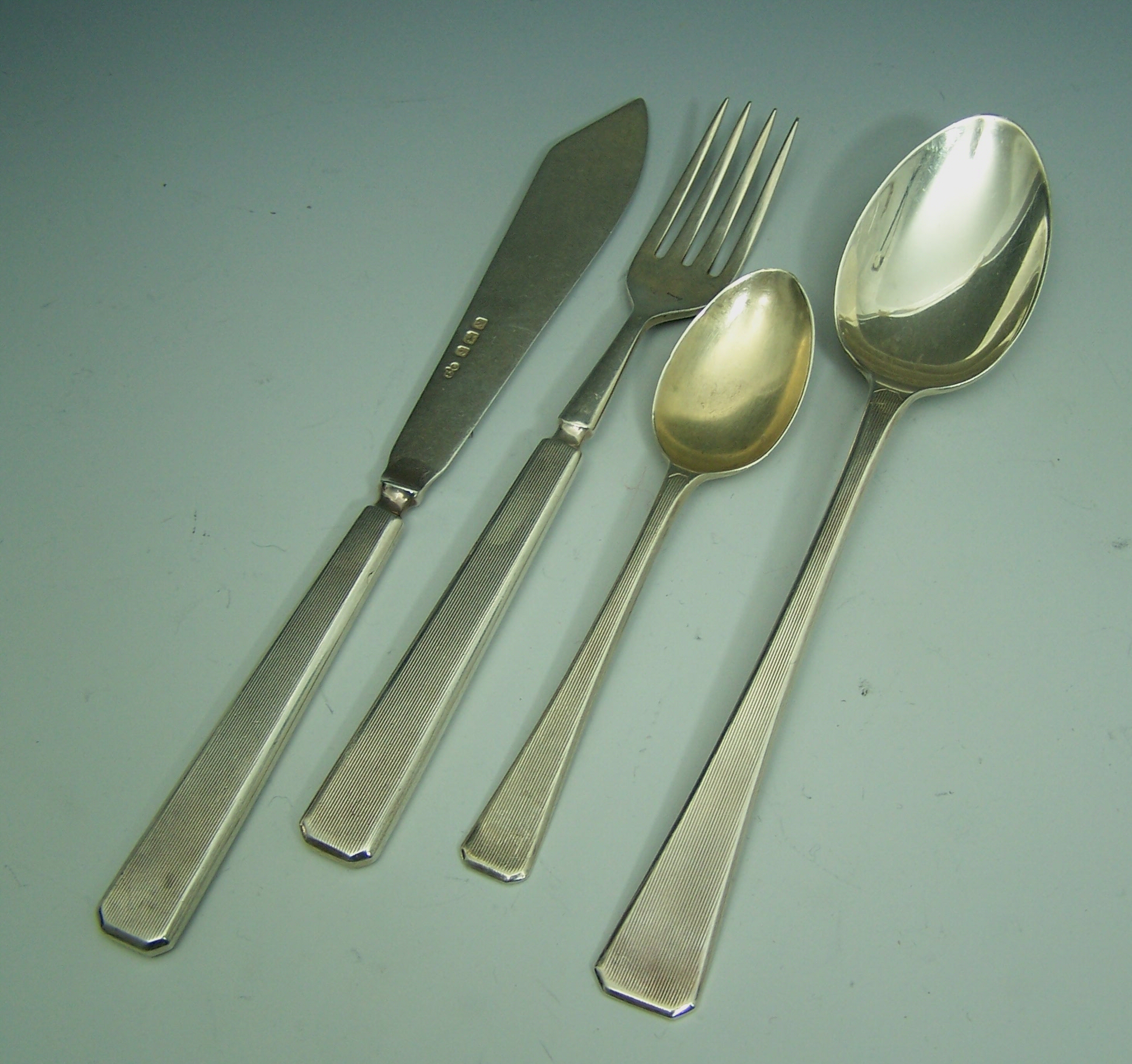 by Elkington and Co., Sheffield 1954, comprising six soup spoons, seven dessert spoons, six dessert forks, six fish knives and forks; together with two matched teaspoons (Qty)
