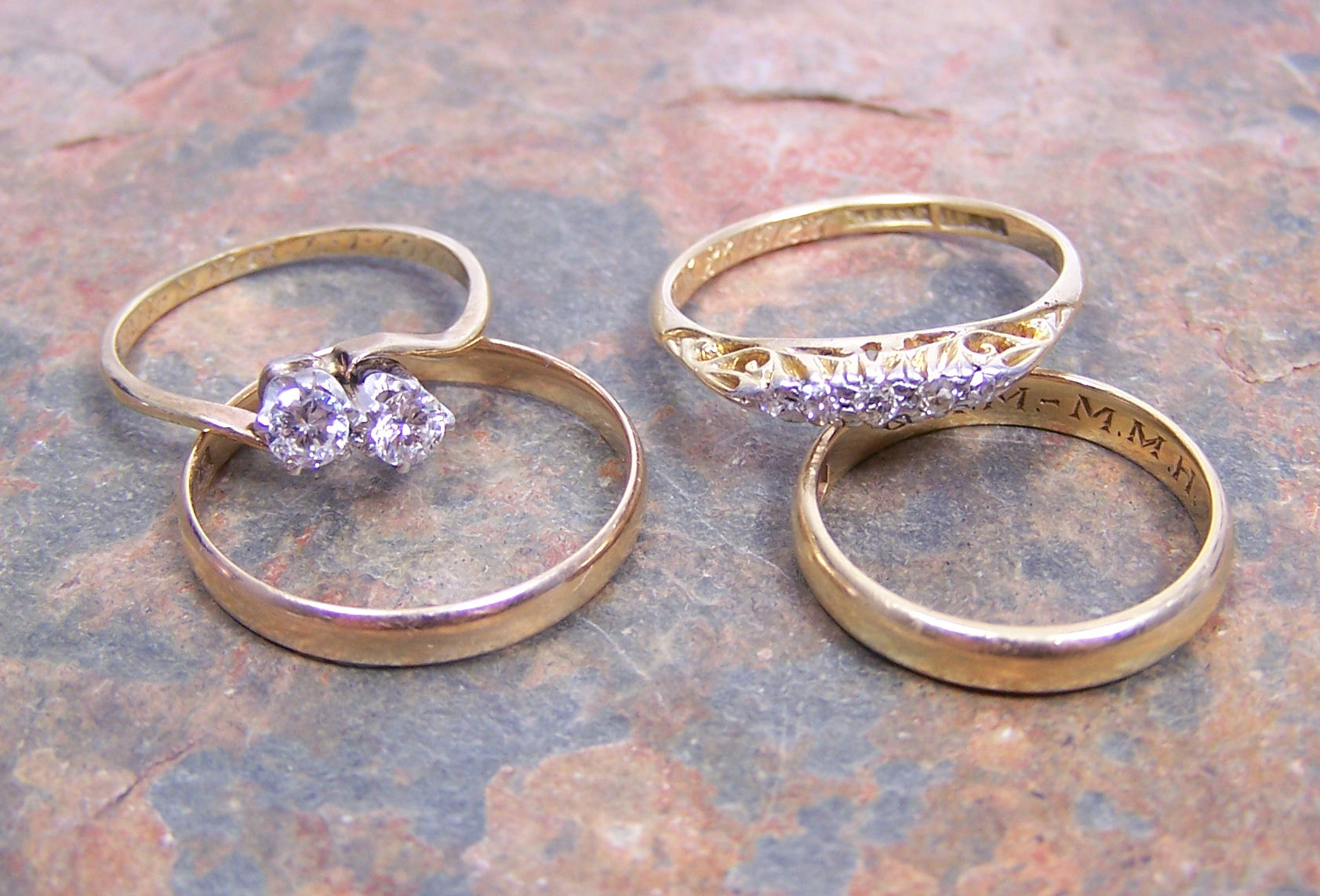 of cross-over design, claw set with uniform round brilliant cut diamonds; a claw set diamond five-stone ring; an 18ct gold wedding band and another similar wedding band (4)