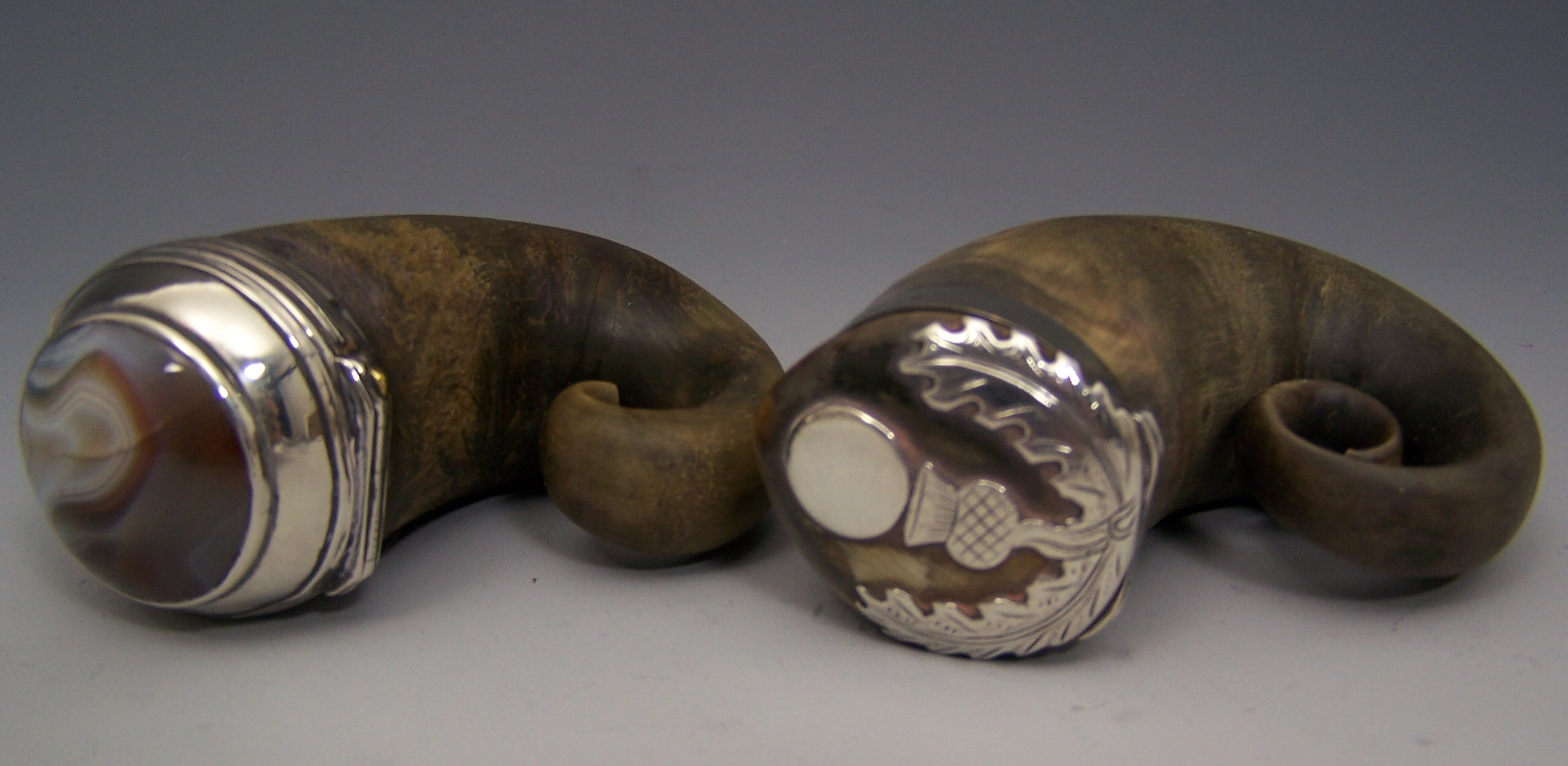 mounts unmarked, with reeded borders to the domed cover, with Montrose agate central cabochon; together with another similar mull, with horn cover and thistle hinges (2)