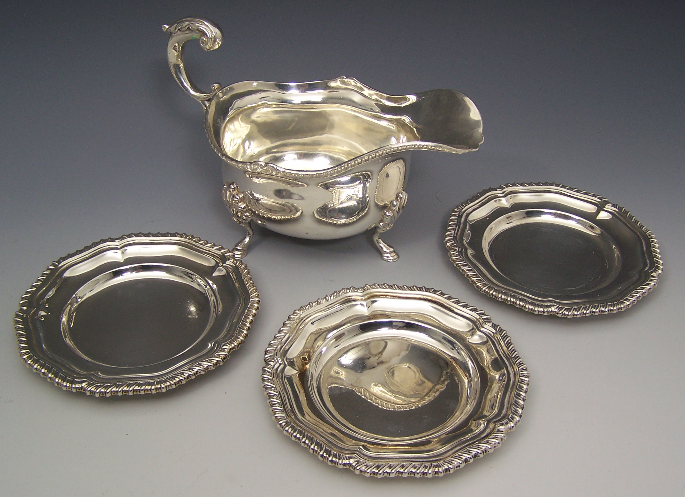 by George Nathan and Ridley Hayes, Chester 1905, with gadrooned border and acanthus topped S-scroll handle, resting on three shell and hoof feet; together with three small dishes, of shaped circular outline with gadrooned borders, London 1966 (4)