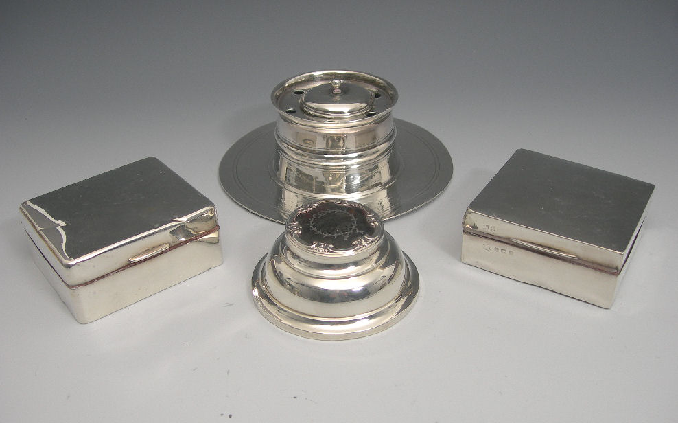 by Gibson and Langham, for Goldsmiths Company, London 1892, the large base, with plain cylindrical body and five pierced pen stands, with presentation inscription for the 2nd Battalion Royal Scots Fusiliers; a small inkwell of stepped circular outline, with floral decorated tortoiseshell hinged cover, Birmingham 1919; together with two cigarette boxes (4)