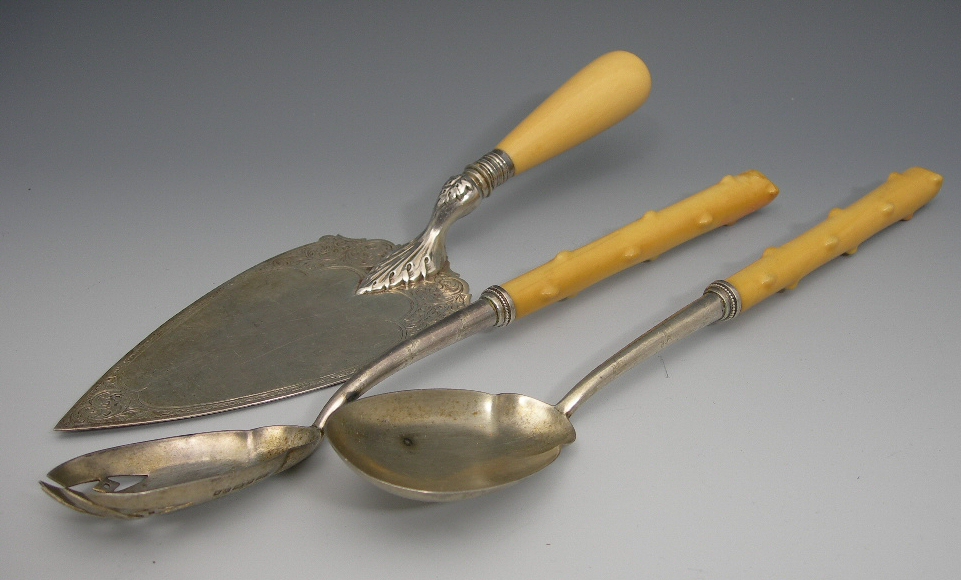 by George Unite, Birmingham 1868, with engraved blade and turned ivory handle; together with a pair of ivory handled salad servers, by Atkins, Sheffield 1856 (3)