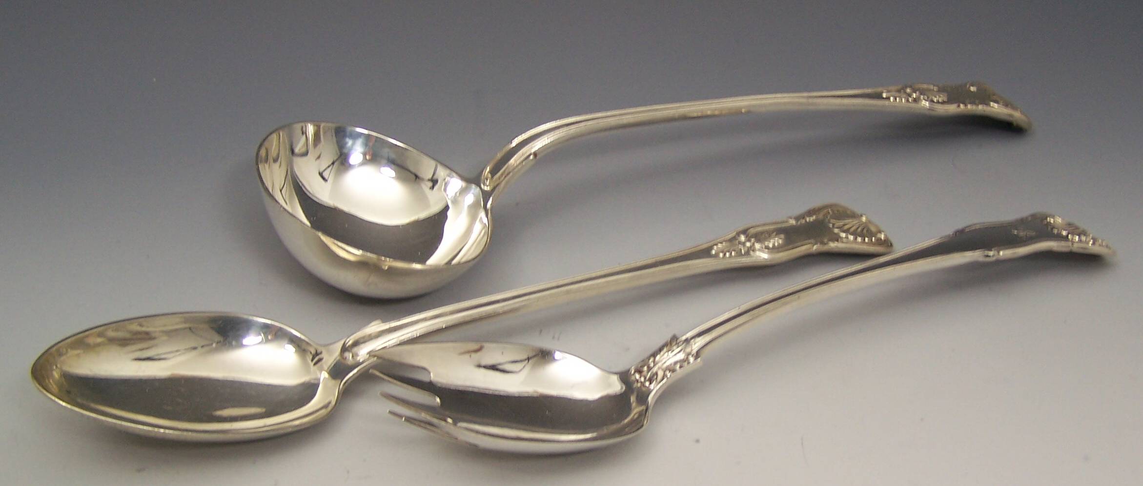 London 1829, maker's mark worn; a double struck King's pattern serving spoon, London 1847; together with a Queen's pattern large serving fork, London 1838 (3)