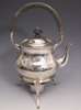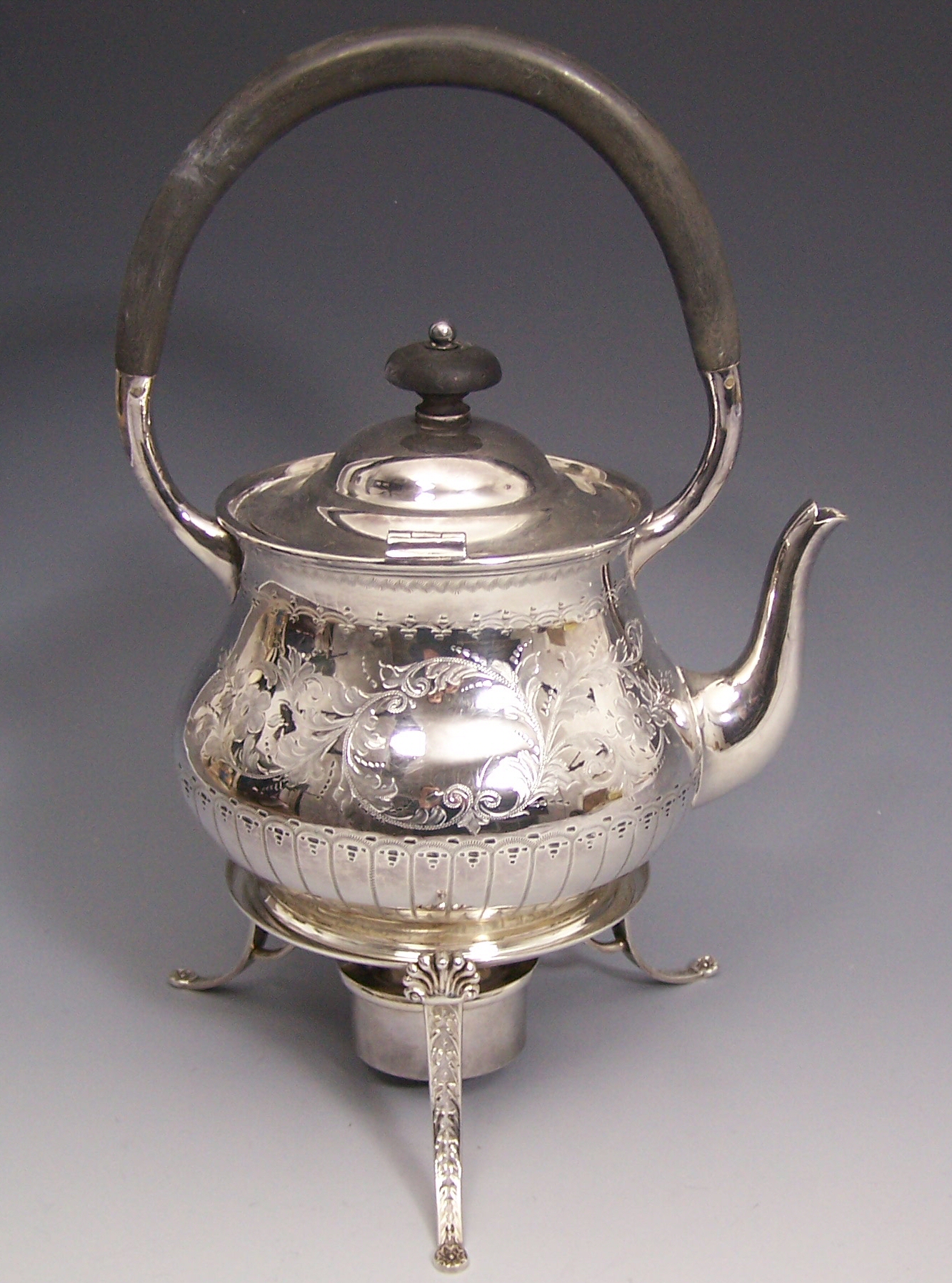 London 1898, by Kemp Brothers, the baluster body with engraved floral and foliate design, with curved spout, slightly domed hinged cover and triform base with foliate decorated legs and shell terminals, with burner