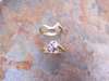 claw set with pear cut diamonds, flanked by scroll shoulders; also a matching 18ct gold shaped wedding band (2)