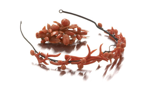 the front set with graduated coral branches and bouton carved coral beads; also a cluster brooch, composed of acorn and foliate carved coral beads (2)