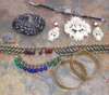 a feathered kiwi brooch, stamped 800, contained in a fitted case; two foliate scroll pierced small gold bangles; an 18ct gold lady's wrist watch head; a silver marcasite set cocktail watch and a fringed necklace (8)
