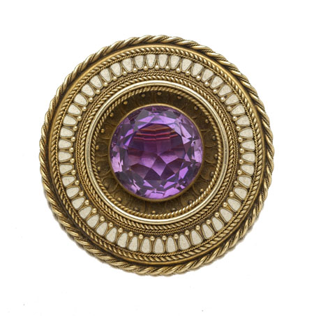 collet set to the centre with a circular cut amethyst, within graduated ropetwist, bead and white enamelled ovolo borders