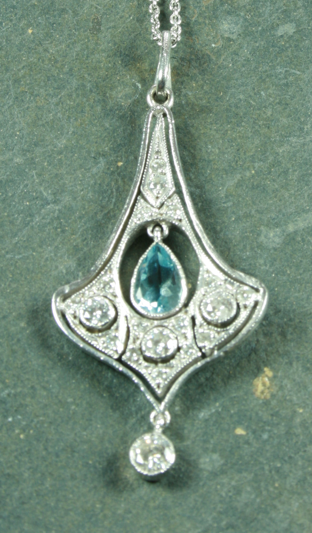 of tapering design, millegrain collet set to the centre with a pear cut aquamarine, within a pierced surround set with graduated round brilliant cut diamonds, suspending a collet set round brilliant cut diamond drop, the whole suspended from a fine trace link chain, stamped 18K